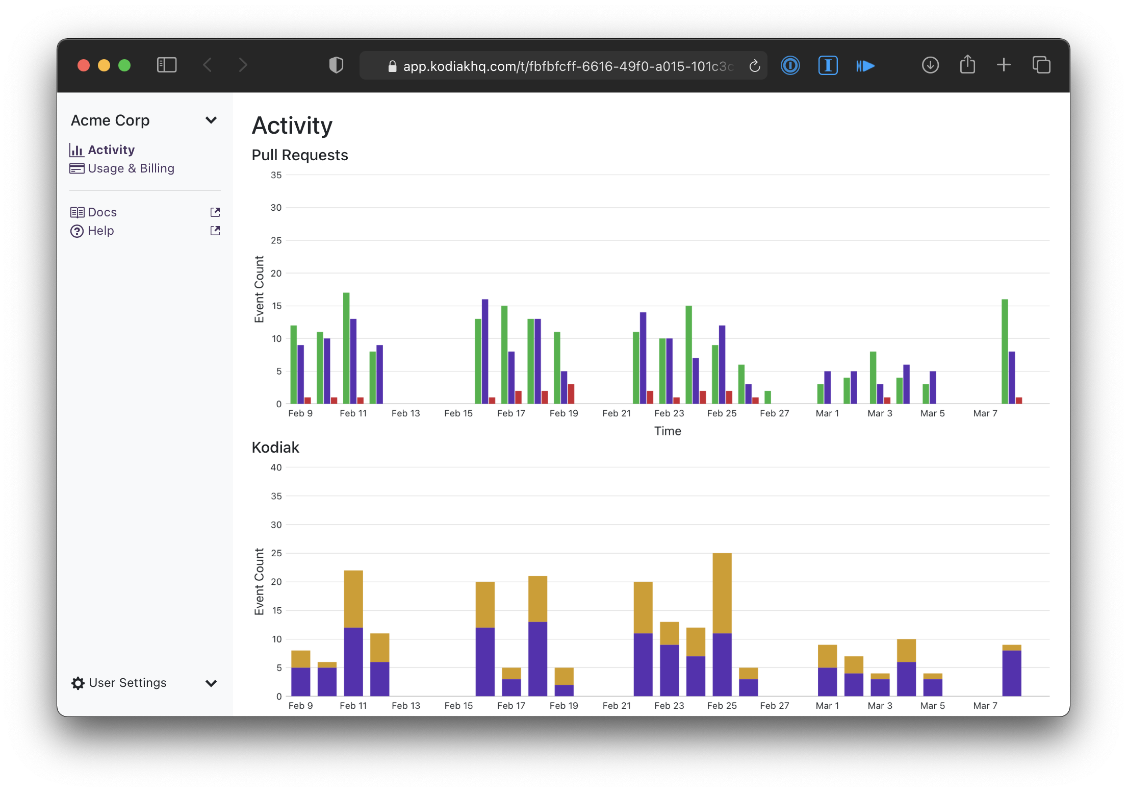 The activity page is the main landing page for the Kodiak dashboard. It shows activity charts and merge queue information.