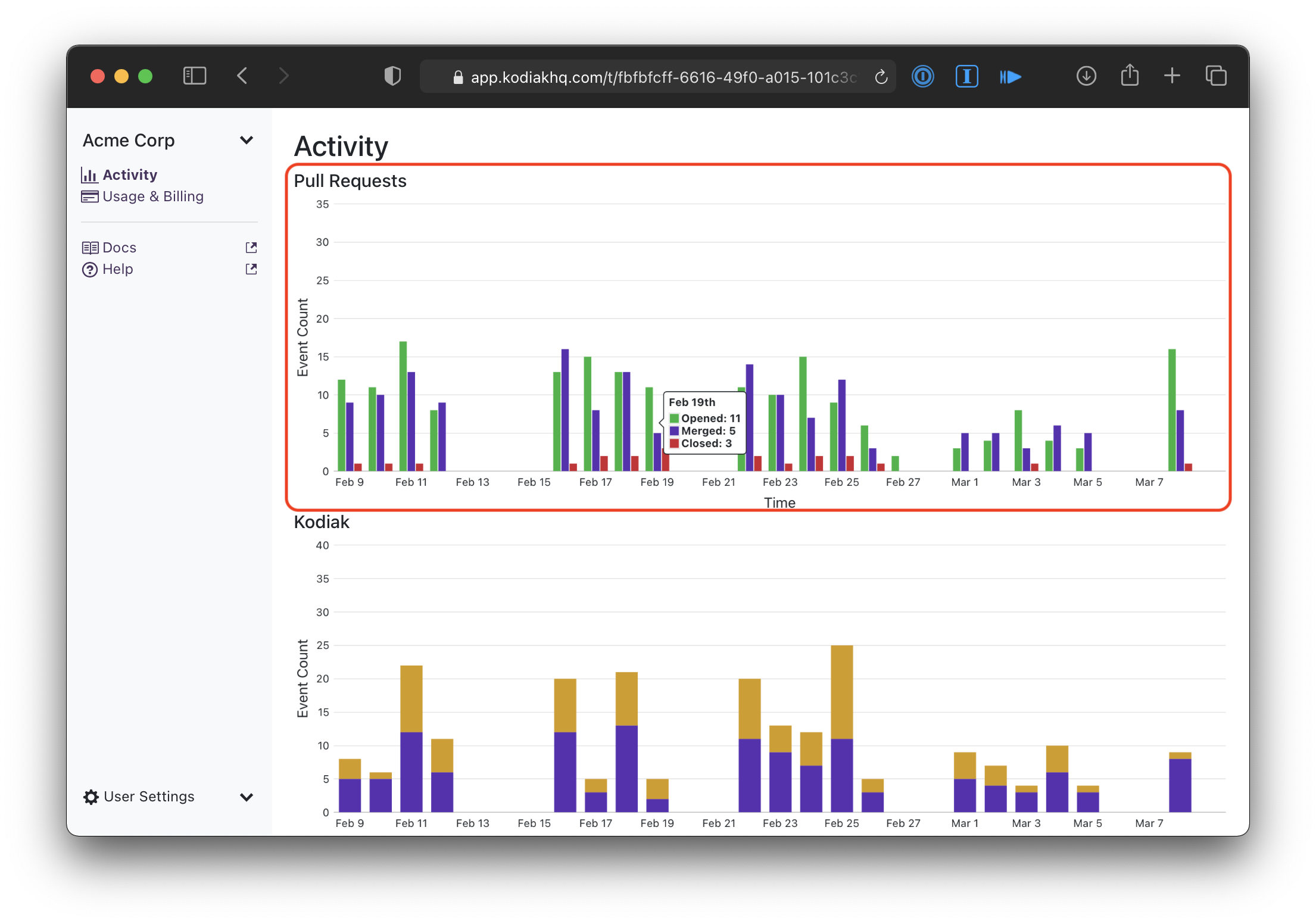 The Kodiak activity chart shows the number of pull requests merged by Kodiak per day.